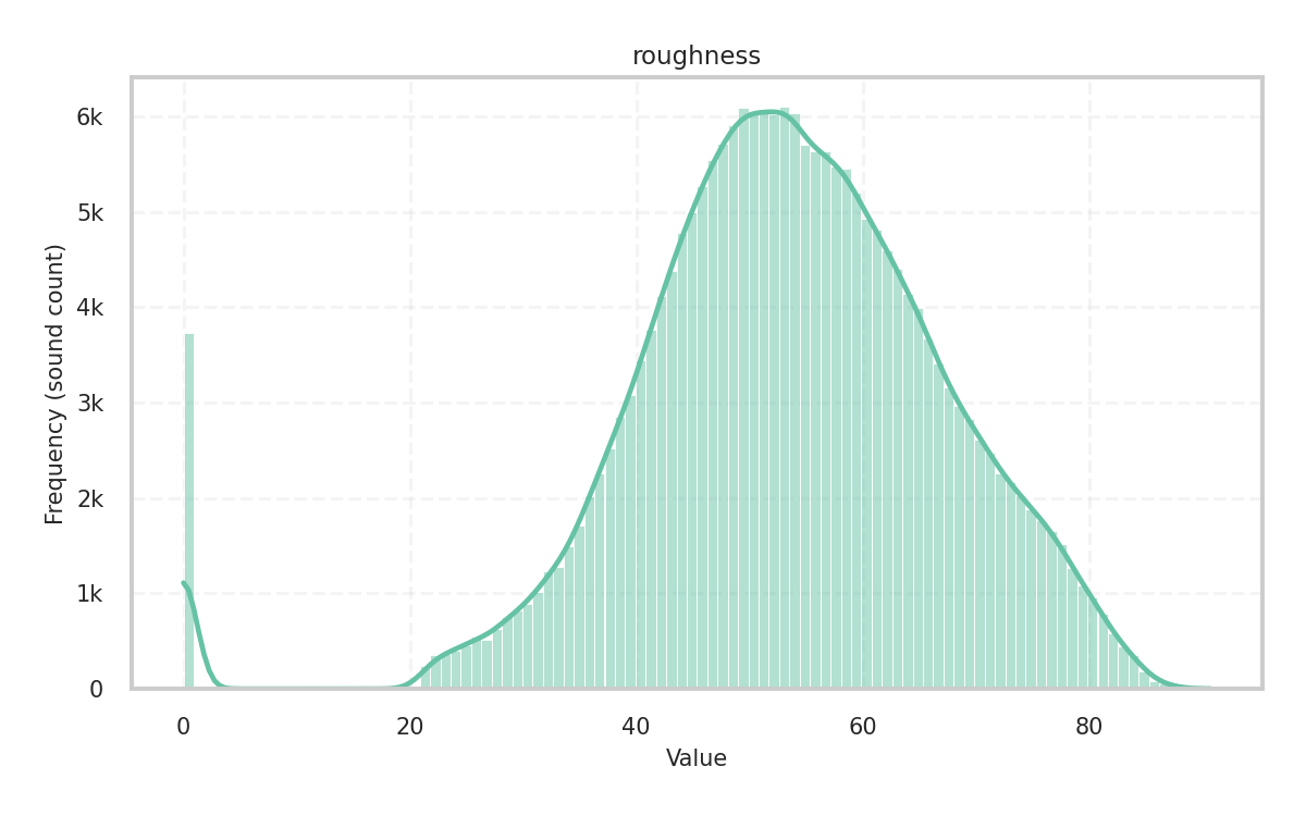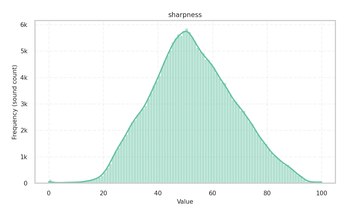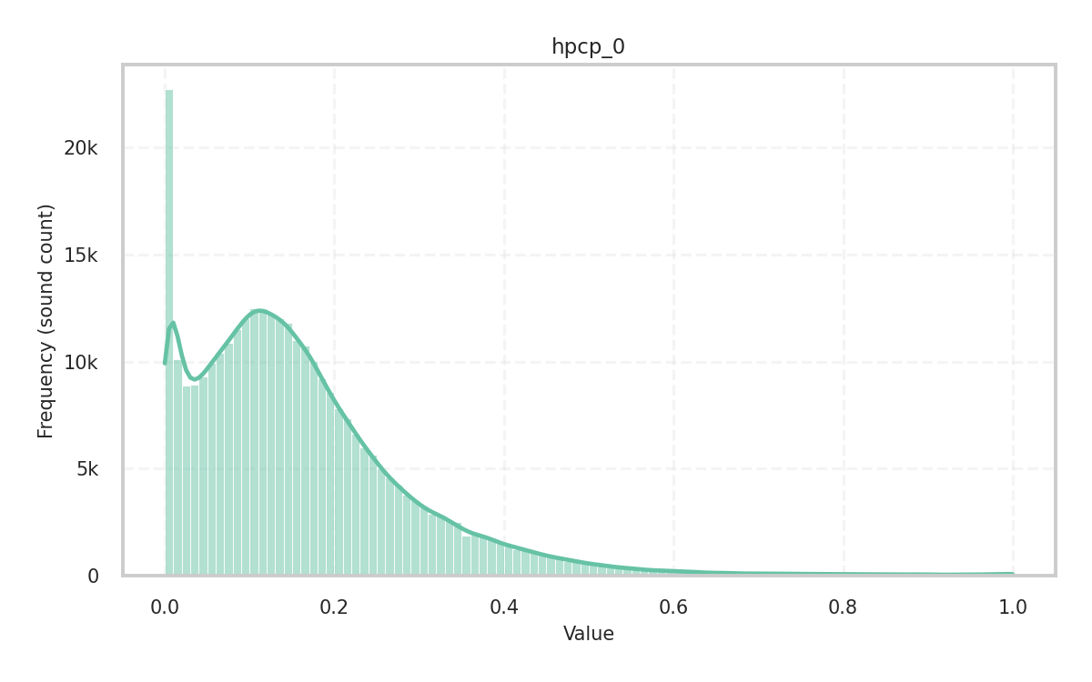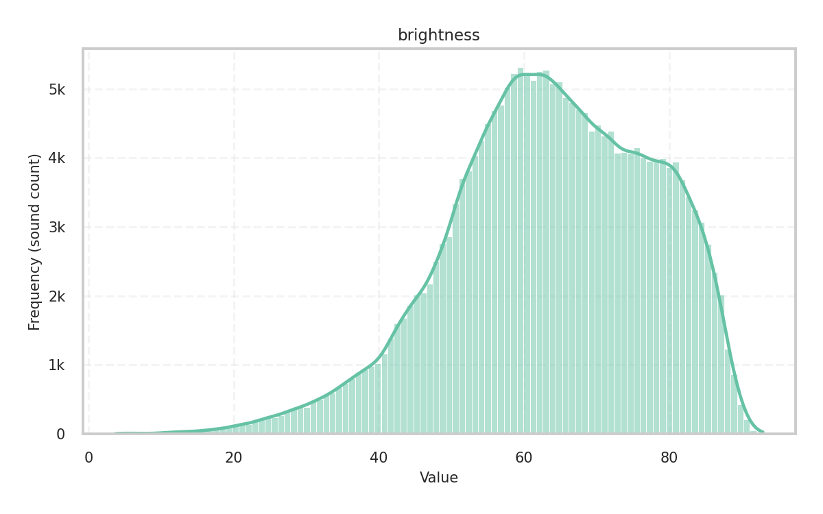 During analysis, the sample rate is 44,100Hz and the audio file’s channels are mixed down to mono. For most descriptors, the frame size is 2,048 samples with a hop size of 1,024, while for some tonal descriptors, the frame size is 4,096 samples with a hop size of 2,048.