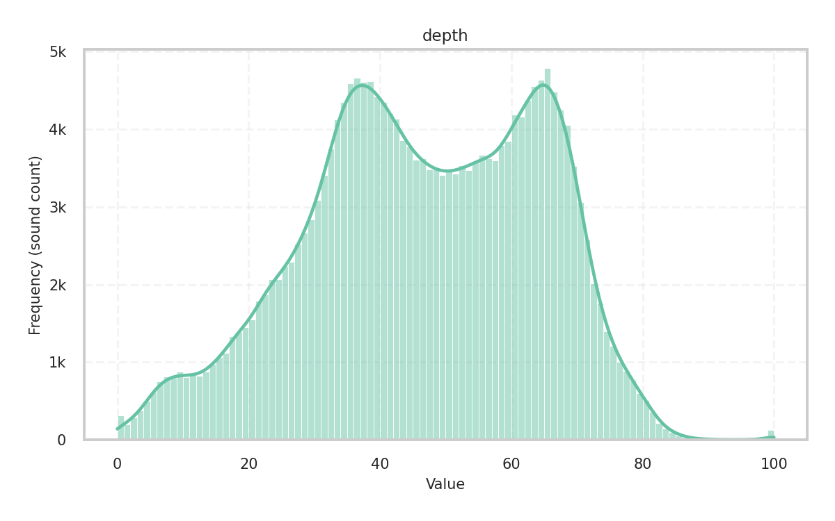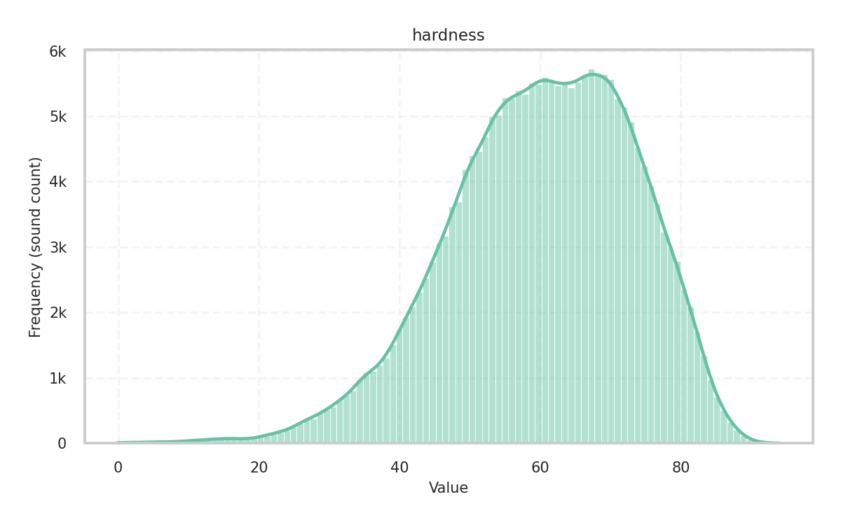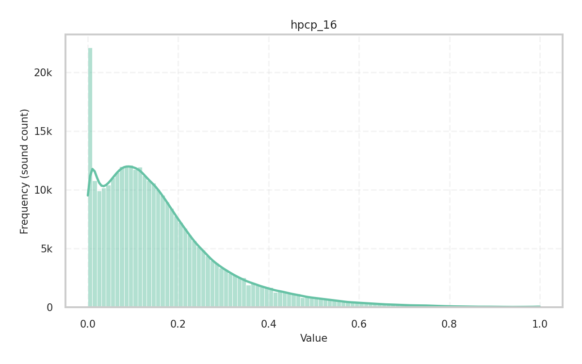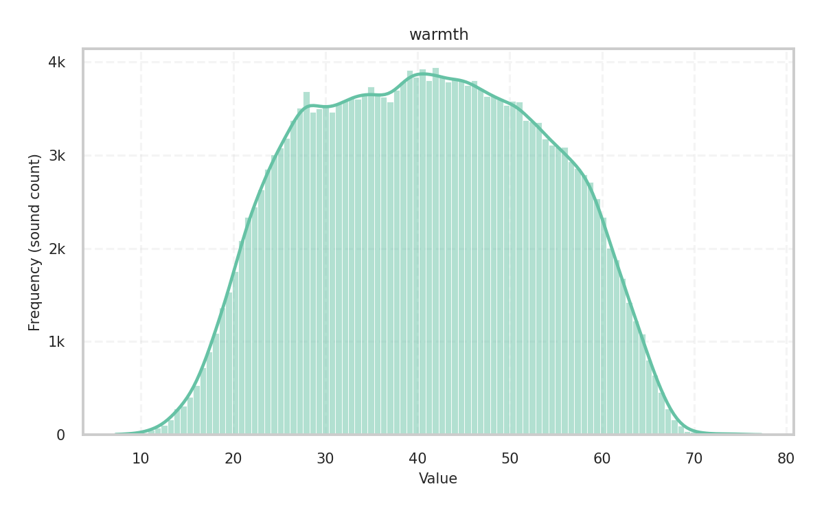 During analysis, the sample rate is 44,100Hz and the audio file’s channels are mixed down to mono. For most descriptors, the frame size is 2,048 samples with a hop size of 1,024, while for some tonal descriptors, the frame size is 4,096 samples with a hop size of 2,048.