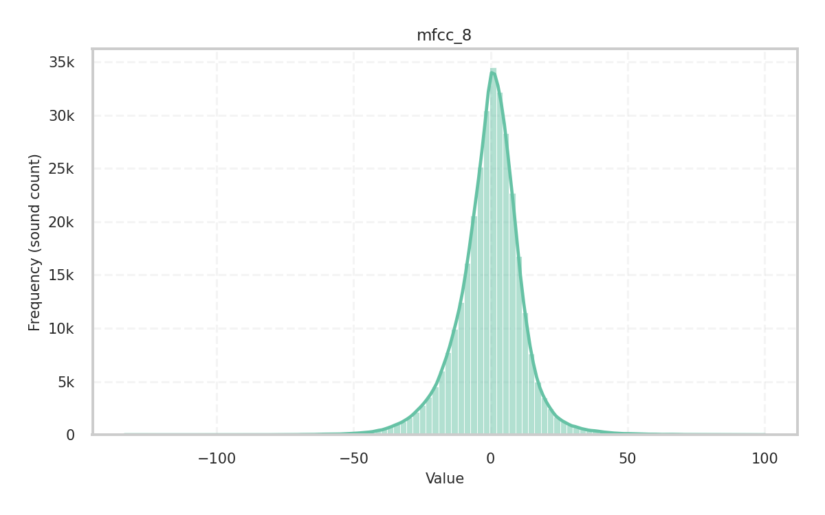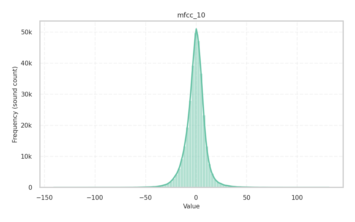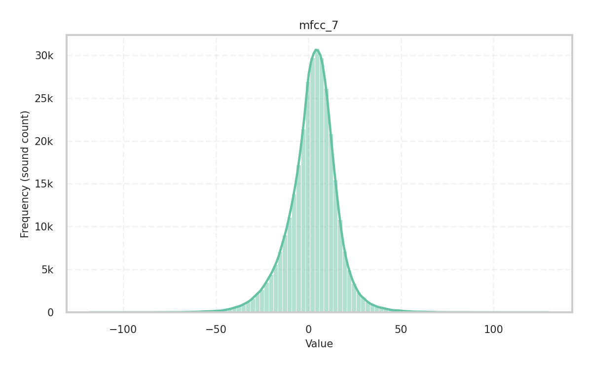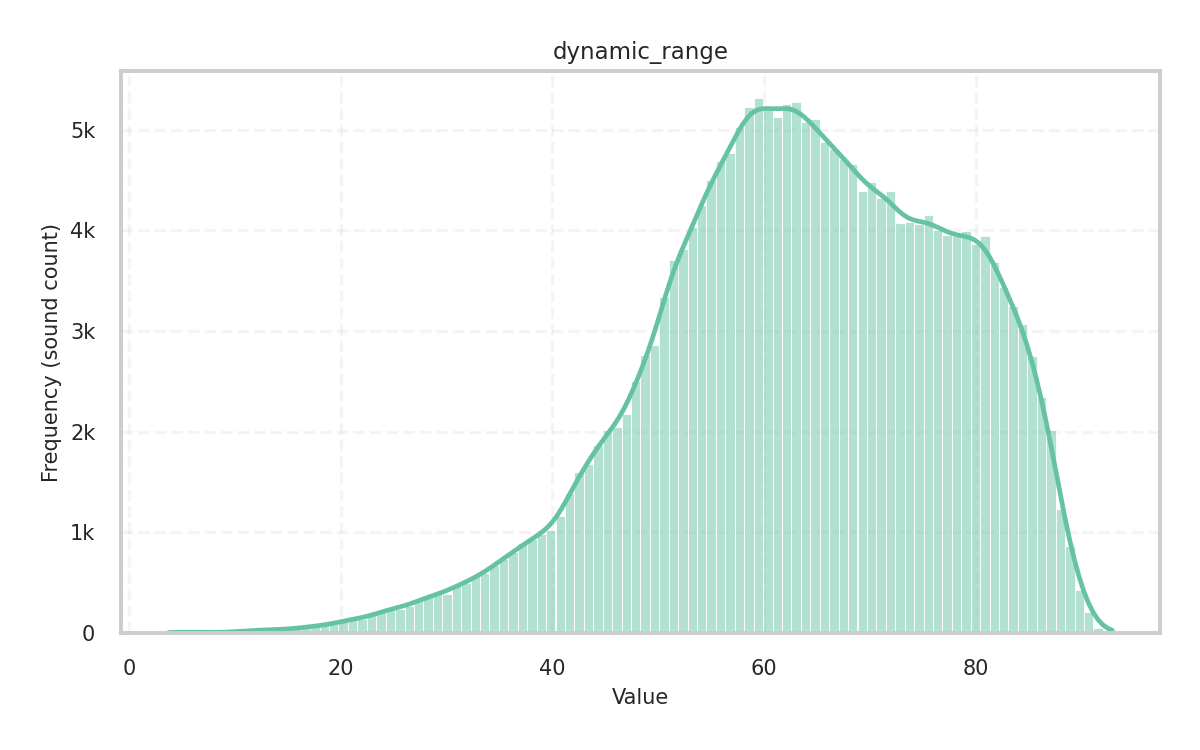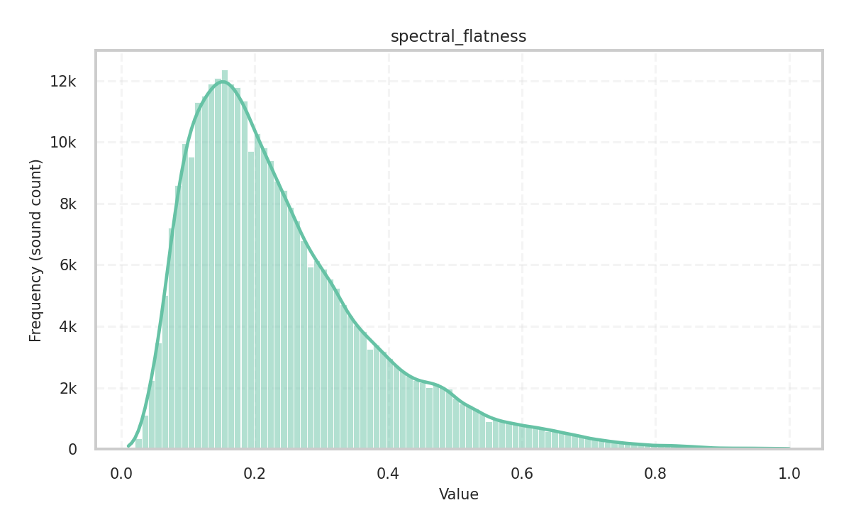 Description: Flatness of the spectrum measured as the ratio of its geometric mean to its arithmetic mean (in dB). High values indicate a noise-like, flat spectrum with evenly distributed power, while low values indicate a tone-like, spiky spectrum with power concentrated in a few frequency bands.