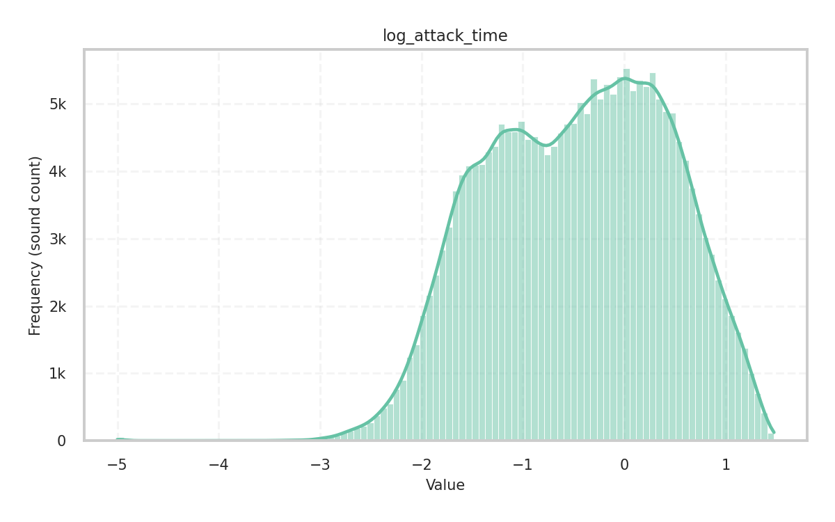 Description: Log (base 10) of the attack time of the audio signal’s envelope, where the attack time is defined as the time duration from when the sound becomes perceptually audible to when it reaches its maximum intensity.