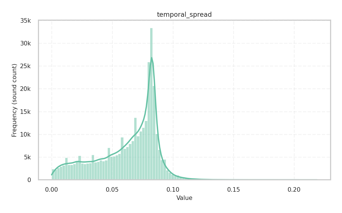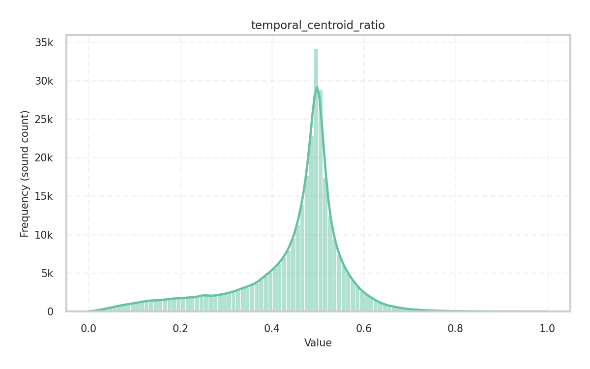 Description: Ratio of the temporal centroid to the total length of the audio signal’s envelope, which shows how the sound is ‘balanced’. Values close to 0 indicate most of the energy is concentrated early (decrescendo or impulsive), while values close to 1 indicate energy concentrated late (crescendo).
