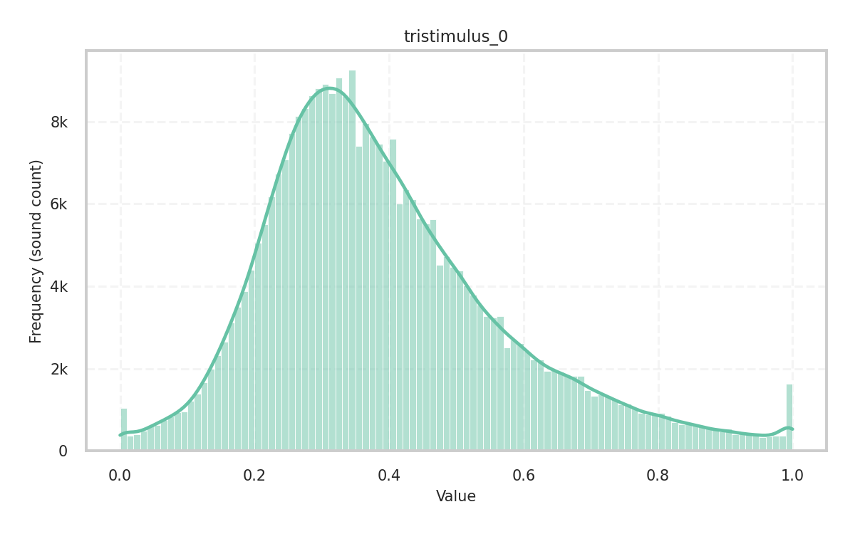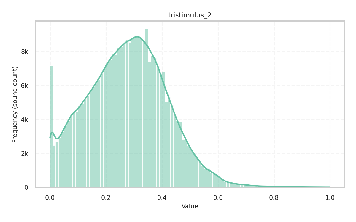 Description: Tristimulus of the audio signal given its harmonic peaks. It measures the relative contribution of harmonic groups in a signal’s spectrum, where the first value captures the first harmonic, the second captures harmonics 2-4, and the third captures all remaining harmonics. It is a timbre equivalent to the color attributes in the vision.