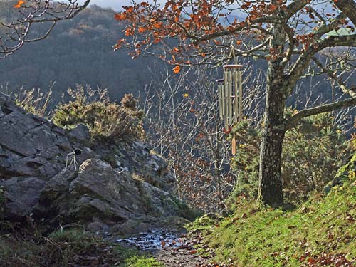 On 21st November 2012 I took out with me a large and a small set of cheap bamboo chimes and two sets of Woodstock (quality, metal) wind chimes. I hung the chimes on small low branches of a particular well situated stunted tree at Sharp Tor just by the Hunter's Path, which overlooks the over-steepened valley (popularly known as the Teign Gorge, though it is not actually a gorge) very near Castle Drogo. In reality the rocky crag rather blocks off the view and most direct sound from the River Teign at the bottom of the valley, and at this spot it was necessary for me to have the recorder facing the other way, back towards the Hunter's Path.
